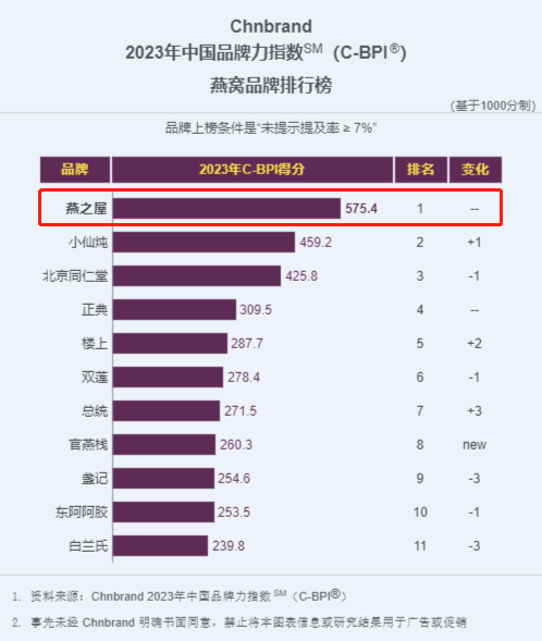 圖:燕之屋榮登2023年(第十三屆)中國品牌力指數(shù)SM(C-BPI®)燕窩品類排行榜第一