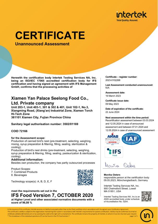 圖:燕之屋獲得BRC、IFS歐洲品質(zhì)雙認(rèn)證