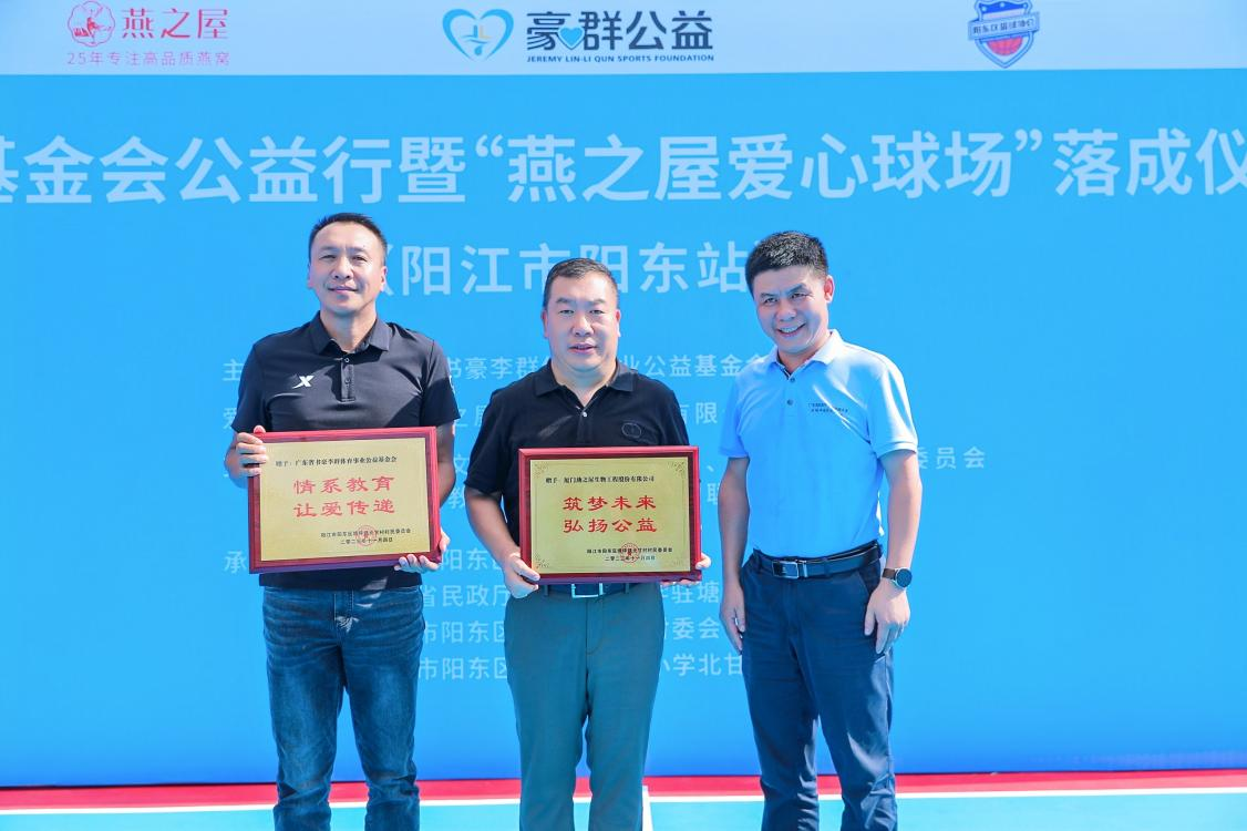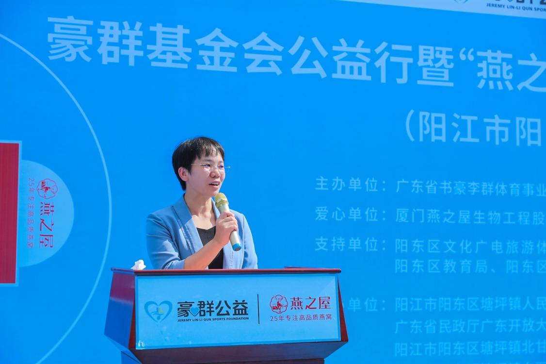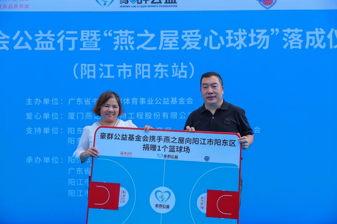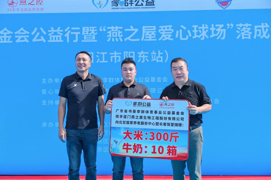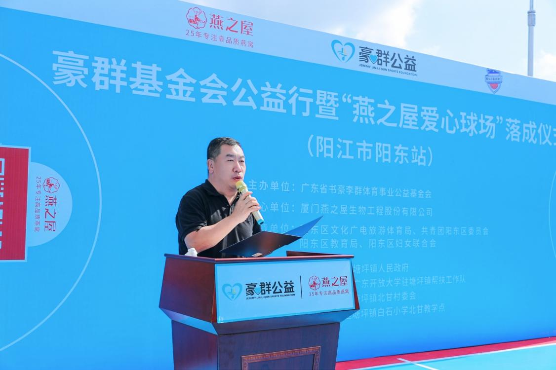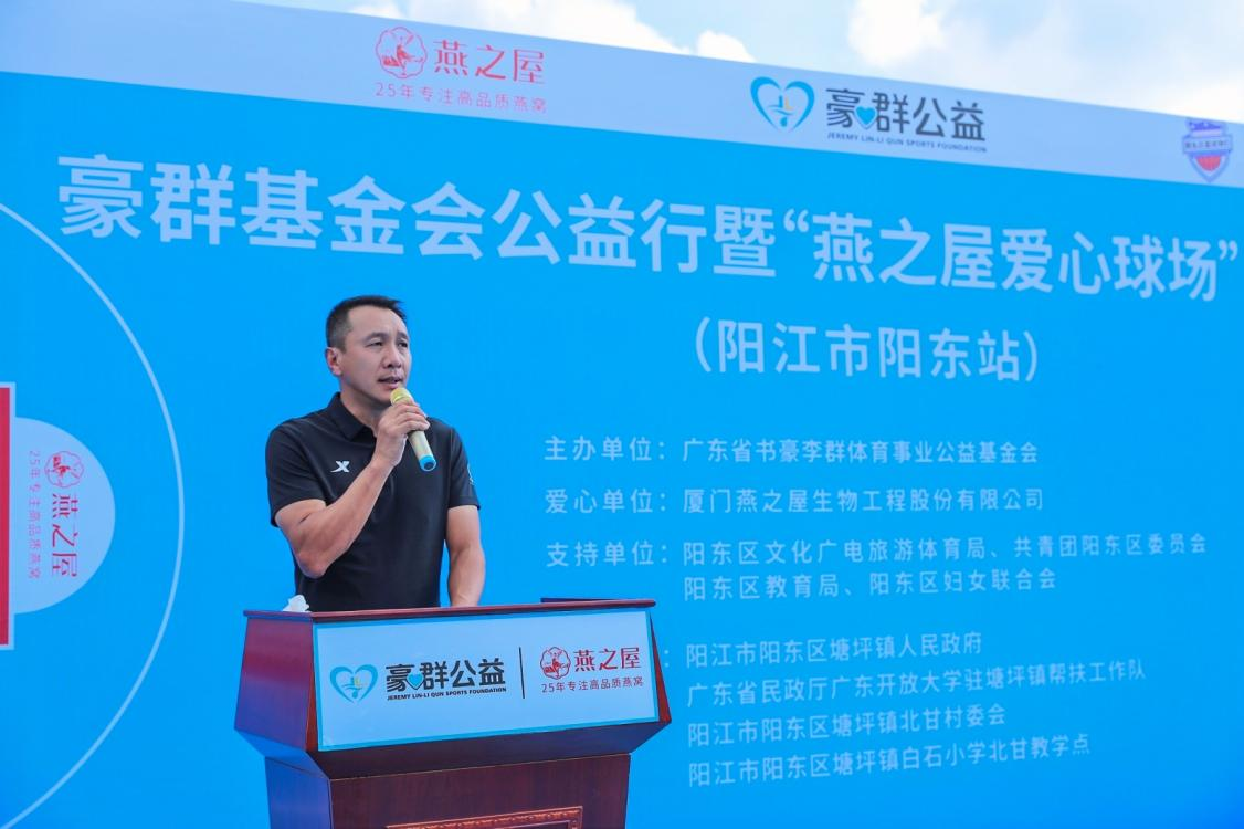 廣東省第十三屆政協(xié)委員、中國籃球名宿、廣東省書豪李群體育事業(yè)公益基金會(huì)理事長(zhǎng)李群在致辭中提到,9月份,豪群基金會(huì)攜手愛心企業(yè)燕之屋和燕之屋總裁李有泉,一同為陽東區(qū)捐建的公益球場(chǎng)率先在北甘村完工,為村民提供全新的運(yùn)動(dòng)場(chǎng)所,并對(duì)燕之屋以及燕之屋總裁李有泉對(duì)公益的關(guān)注和支持表示感謝。