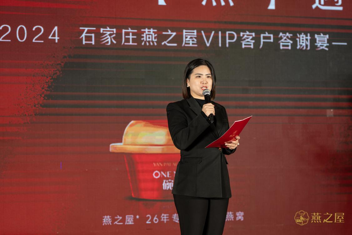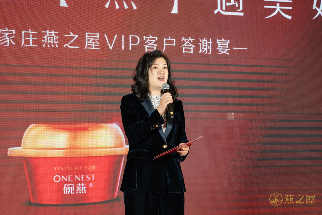 在熱烈的掌聲中,燕之屋石家莊合作商、河北法桐商貿(mào)有限公司總經(jīng)理趙寧上臺(tái)致辭,她說道:“在這個(gè)特殊的場合,我想表達(dá)我們對每一位貴賓的深深感激。正是因?yàn)橛辛四闹С郑庞辛私衲暄嘀菰谙愀鄣纳鲜校ü善贝a:01497.HK)。今年是燕之屋企業(yè)成立的26周年,26個(gè)寒暑走過,我們初心不改,終于讓燕之屋成為了家喻戶曉的高端燕窩品牌,用品質(zhì)和服務(wù)征服了數(shù)以萬計(jì)的客戶。”她與在座貴賓共同舉杯敬酒,向各位賓朋致以由衷謝意。