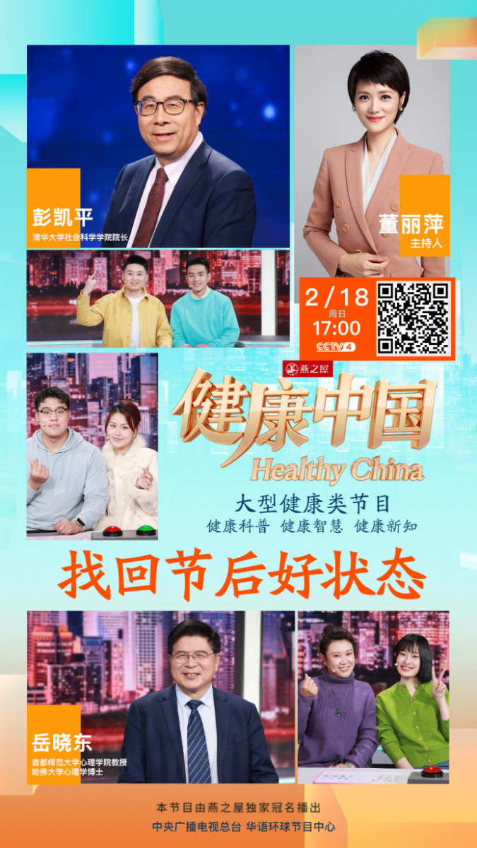 本期,由燕之屋獨家冠名的CCTV-4大型健康類欄目《健康中國》特邀首都師范大學(xué)心理學(xué)院教授、哈佛大學(xué)心理學(xué)博士岳曉東和清華大學(xué)社會科學(xué)學(xué)院院長彭凱平教授,以及北京大學(xué)第三醫(yī)院運動醫(yī)學(xué)科的苗欣博士,與您共同探討如何找回節(jié)后好狀態(tài)。