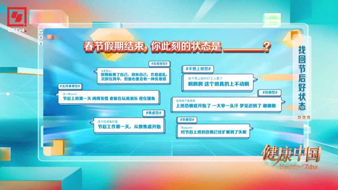 本期《健康中國》邀請到三組頗具特色的嘉賓。第一組嘉賓張曉彤和他的朋友劉睿文,一位是體育愛好者,一位是上班族。愉快的假期過后,劉睿文卻在節(jié)后第一天提不起精神,面對身體出現(xiàn)的不適感,讓她無所適從,節(jié)目中專家在線支招。