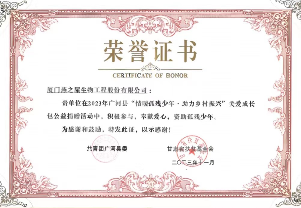 圖:燕之屋榮獲廣河縣“情暖孤殘少年·助力鄉(xiāng)村振興”關(guān)愛(ài)成長(zhǎng)包公益捐贈(zèng)活動(dòng)榮譽(yù)證書
