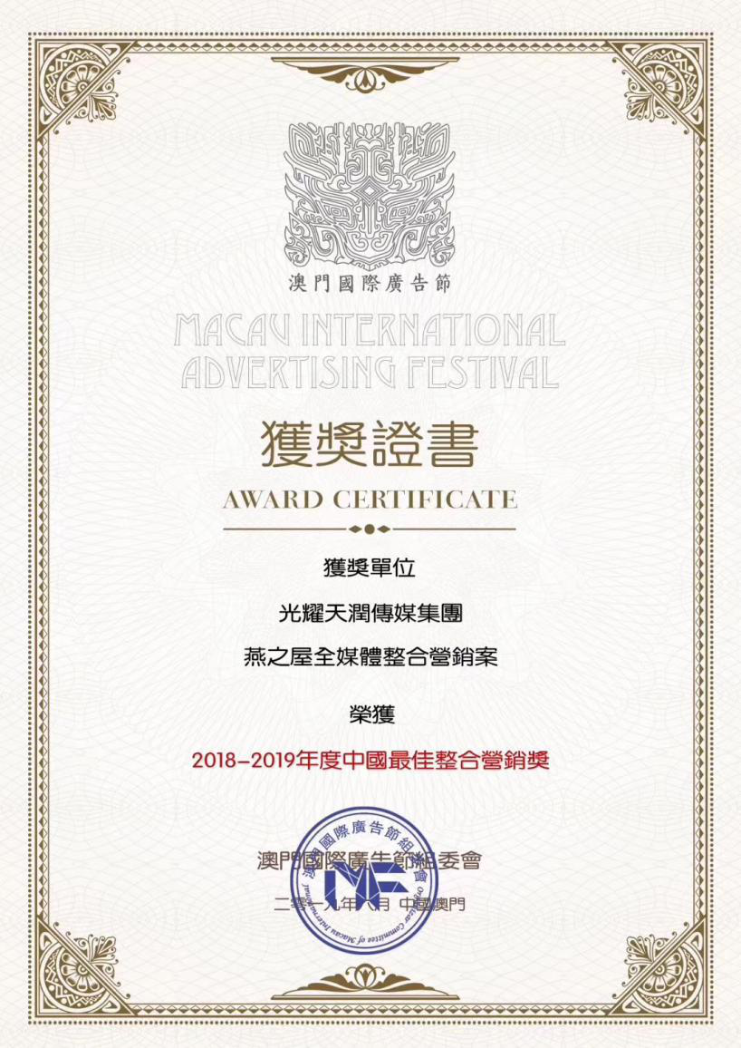 燕之屋榮膺澳門國際廣告節(jié)“2018-2019年度中國最佳整合營銷獎”