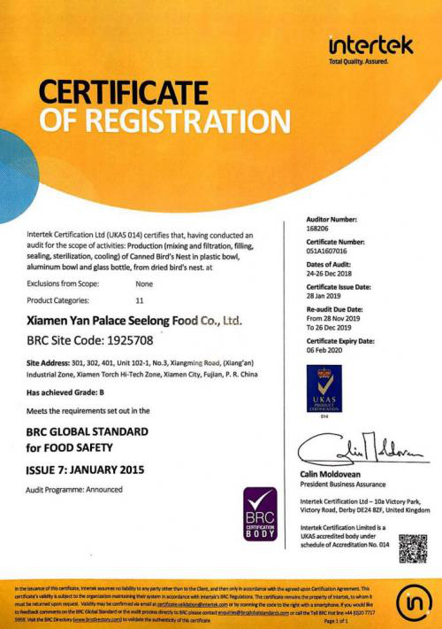 2017年,燕之屋全線產(chǎn)品通過BRC全球食品安全標(biāo)準(zhǔn)認(rèn)證,不僅標(biāo)志著燕之屋取得出口歐盟的通行證,獲得了進(jìn)入國(guó)際市場(chǎng)的敲門磚,還彰顯了其燕窩品質(zhì)和實(shí)力水平,在食品品質(zhì)與安全上得到了極高的肯定。更高水準(zhǔn)、國(guó)際標(biāo)準(zhǔn)的監(jiān)督與反饋,讓燕之屋的燕窩產(chǎn)品、生產(chǎn)基地、服務(wù)售后始終領(lǐng)先于行業(yè)標(biāo)準(zhǔn),成為燕窩行業(yè)的"品質(zhì)名片",也正是燕之屋對(duì)自己嚴(yán)標(biāo)準(zhǔn)、高要求的實(shí)力見證。