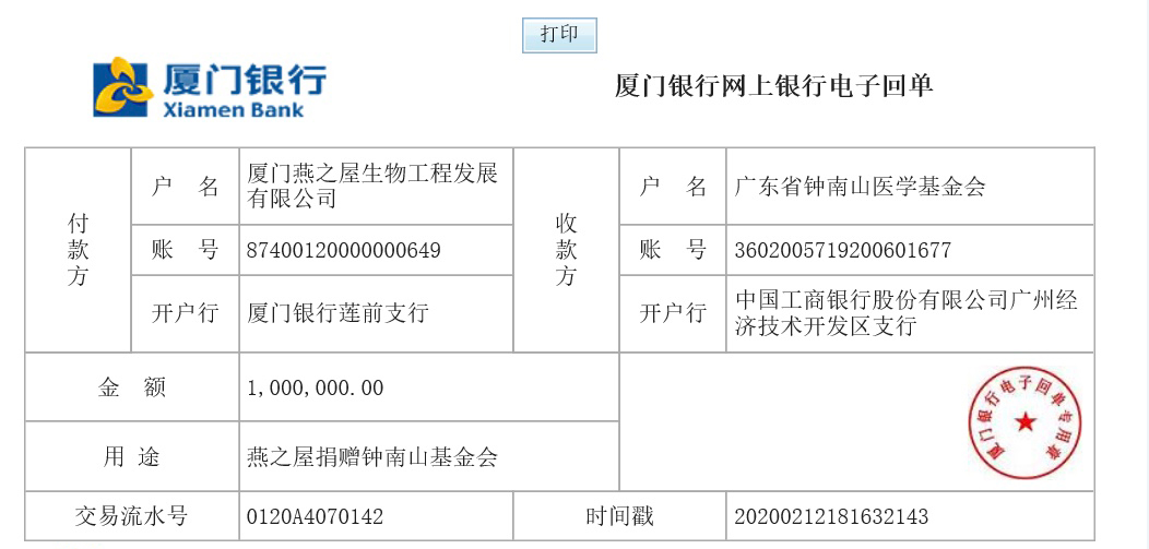第二批捐款已到位!燕之屋向鐘南山醫(yī)學(xué)基金會捐贈100萬元