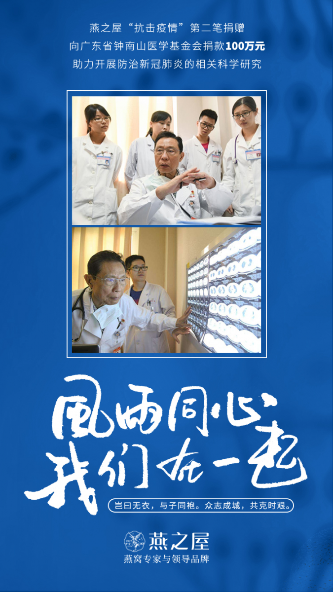 為支持抗擊新冠肺炎疫情,2月12日,廈門燕之屋生物工程發(fā)展有限公司向廣東省鐘南山醫(yī)學(xué)基金會捐款100萬元,助力開展防治新冠肺炎的相關(guān)科學(xué)研究。鐘南山院士是中國著名呼吸病學(xué)專家,長期從事呼吸內(nèi)科的醫(yī)療、教學(xué)、科研工作,擁有過硬的專業(yè)知識以及抗擊“非典”的寶貴經(jīng)驗。自武漢地區(qū)疫情展露之初,鐘南山院士便率領(lǐng)團(tuán)隊前往一線救治病患,在疫情防控及相關(guān)診療、藥物研發(fā)等工作上殫精竭慮,爭分奪秒與病毒賽跑,竭力搶救寶貴生命,守護(hù)人民健康。