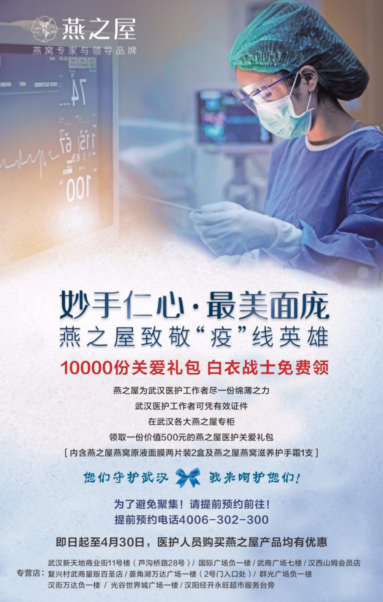 4月9日,湖北武漢正式解除“離漢離鄂通道管控措施”的第二天,燕之屋便在這座“英雄的城市”,專門為“疫”線英雄們舉辦了一場公益愛心活動:凡是在武漢的醫(yī)務(wù)工作者,只要憑借有效證件,即可到燕之屋武漢的10家門店柜臺,免費領(lǐng)取燕之屋醫(yī)護關(guān)愛禮包一份(內(nèi)含2份燕之屋燕窩原液面膜兩片裝2盒及燕之屋燕窩滋養(yǎng)護手霜1支),限量1萬份。這場呵護醫(yī)護人員面部和手部的專場活動,也將持續(xù)到4月的最后一天。