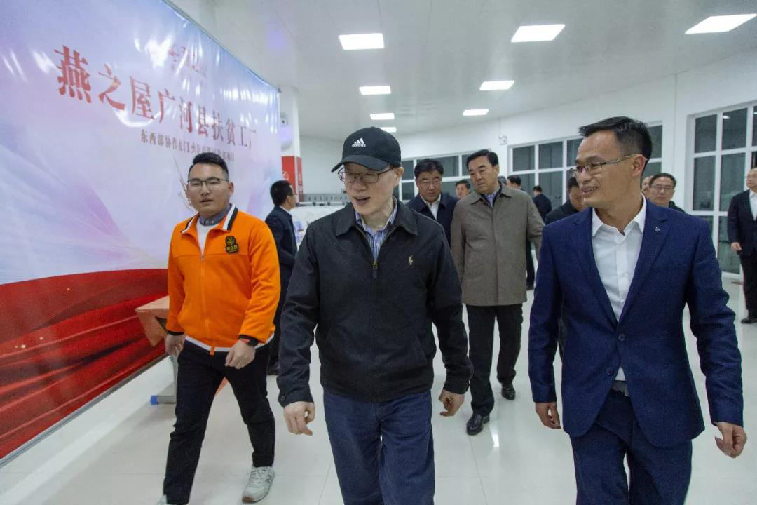 圖:2019年10月22日,國(guó)臺(tái)辦主任劉結(jié)一(中)蒞臨燕之屋廣河縣扶貧工廠考察