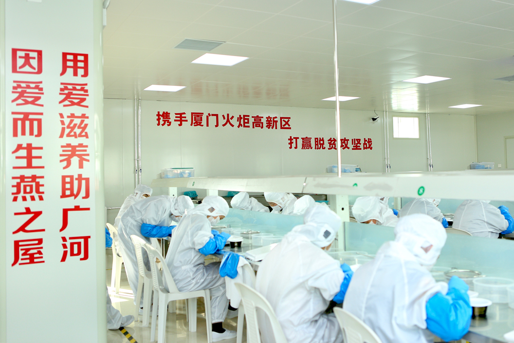 在燕之屋扶貧工廠干凈衛(wèi)生的高標(biāo)準(zhǔn)無(wú)塵車間里,當(dāng)?shù)貑T工主要從事燕窩挑揀工作,經(jīng)過(guò)嚴(yán)苛的專業(yè)技能培訓(xùn)后再安排上崗就業(yè)。在全體員工的共同努力下,2020年1月,燕之屋廣河縣工廠總計(jì)完成119kg燕窩產(chǎn)量,是2019年9月至12月的總和;2020年3月完成176kg產(chǎn)量,6月產(chǎn)量更有望突破300kg。