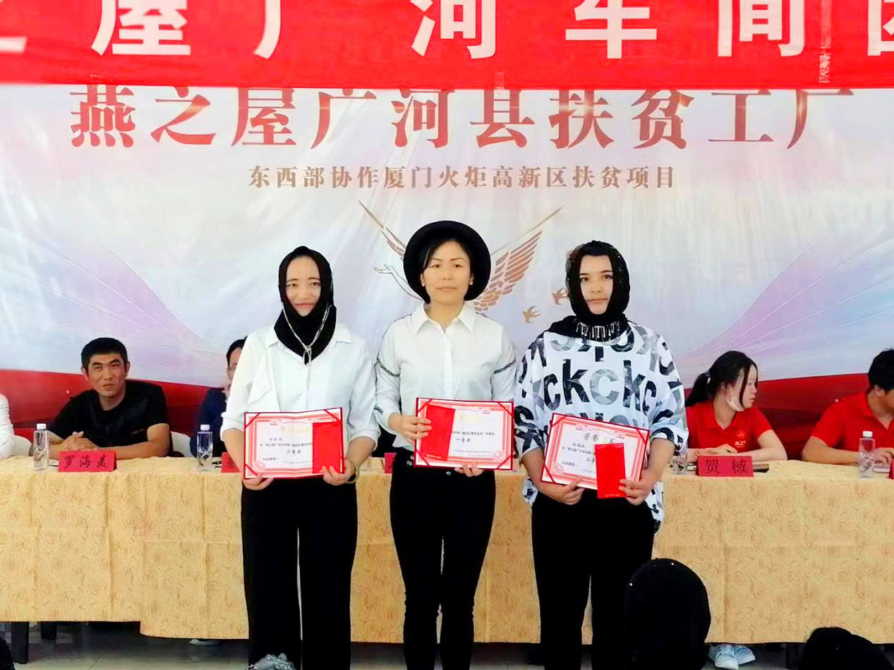 據(jù)悉,燕之屋廣河縣扶貧一期工廠于2019年10月17日成立,總面積為1076㎡,開工時共有83名當(dāng)?shù)毓と?貧困戶81人)。2019年廣河縣20家扶貧車間中,燕之屋所吸納的貧困戶人數(shù),以及所完成的貧困建檔立卡戶均位列第一。2019年,廣河縣貧困戶平均月收入約2000-3000元。燕之屋扶貧工廠落地之后開始實(shí)行純計件工資方案,2020年大批員工月工資超過3000元,4000-5000元也有將近10人,甚至有2名員工超過6000元,工資水平在當(dāng)?shù)厮蟹鲐毱髽I(yè)中穩(wěn)居前列。