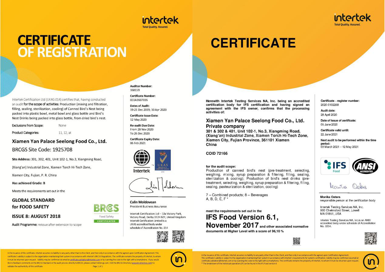 圖:燕之屋獲得歐盟BRC、IFS雙重認(rèn)證