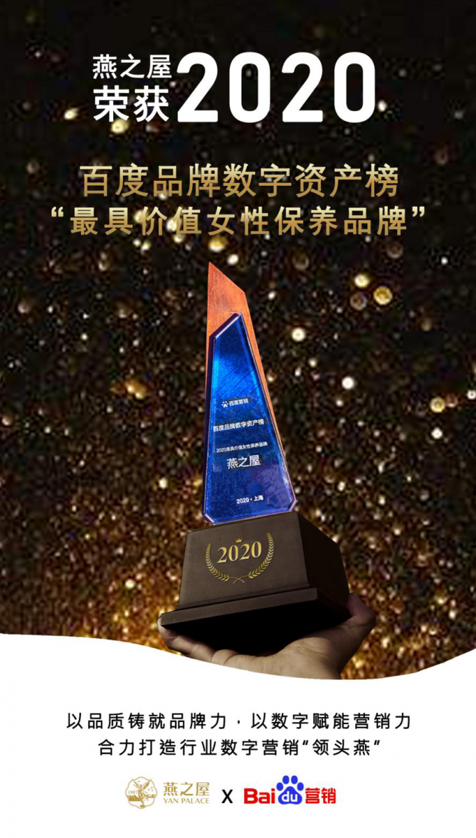 圖:燕之屋榮獲2020百度品牌數(shù)字資產(chǎn)榜“最具價值女性保養(yǎng)品牌”