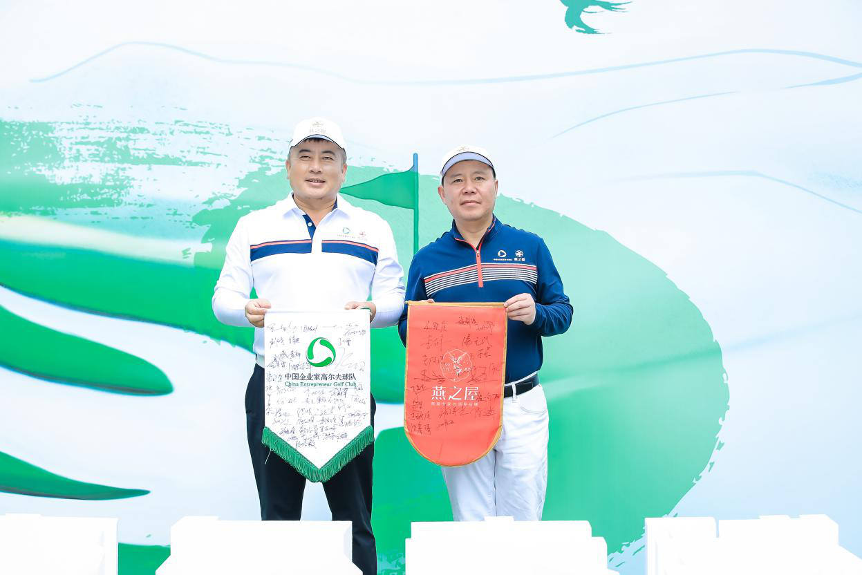 圖 | 中國(guó)企業(yè)家高爾夫球隊(duì)隊(duì)長(zhǎng)王均豪(右)與燕之屋高爾夫球隊(duì)隊(duì)長(zhǎng)牛雷交換隊(duì)旗