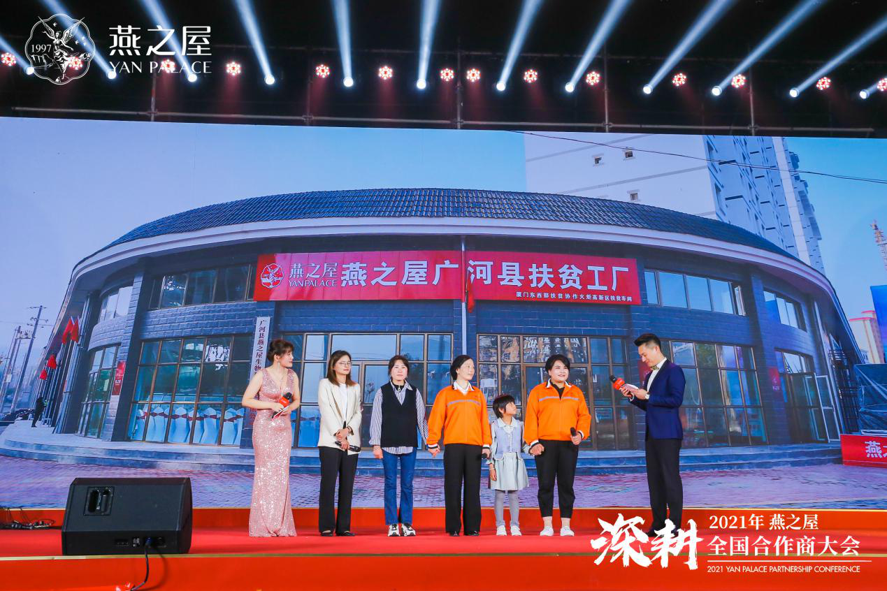 大會當晚,燕之屋安排了豐盛的答謝晚宴,為2021年全國合作商大會畫下圓滿句號。晚宴上,不僅載歌載舞,其樂融融,更有廣河扶貧工廠的優(yōu)秀職工代表發(fā)言,用樸實的話語分享著加入燕之屋后改變?nèi)松恼鎸嵐适?,以及對燕之屋給予的幫助表示由衷的感謝。