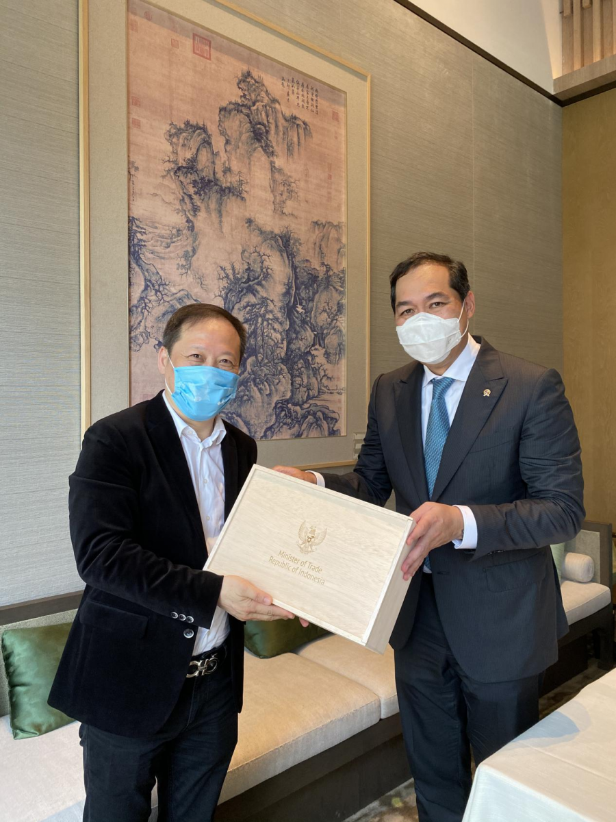 圖:印度尼西亞貿(mào)易部長魯特菲閣下(圖右)向燕之屋董事長黃?。▓D左)贈(zèng)送禮物
