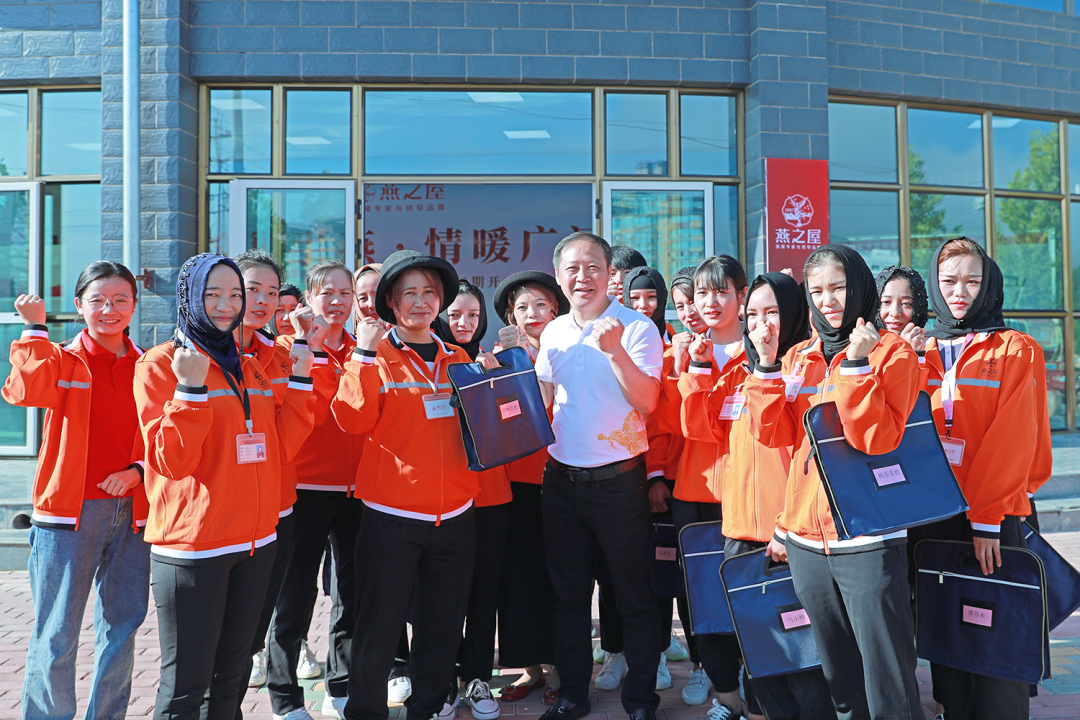 圖:燕之屋創(chuàng)始人、董事長黃健與燕之屋廣河縣扶貧工廠員工合影