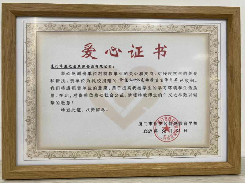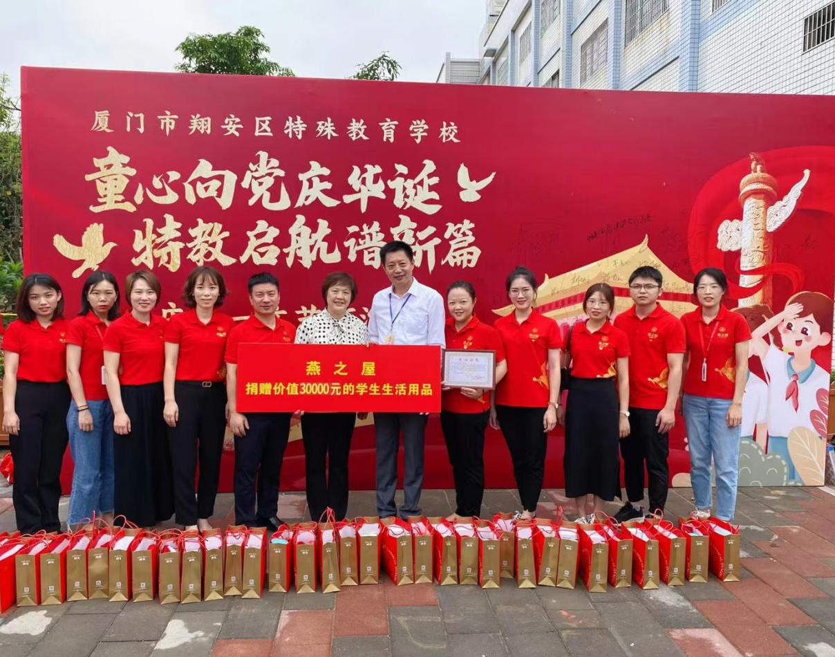 圖:燕之屋向廈門市翔安區(qū)特殊教育學(xué)校捐贈生活用品獲“愛心證書”
