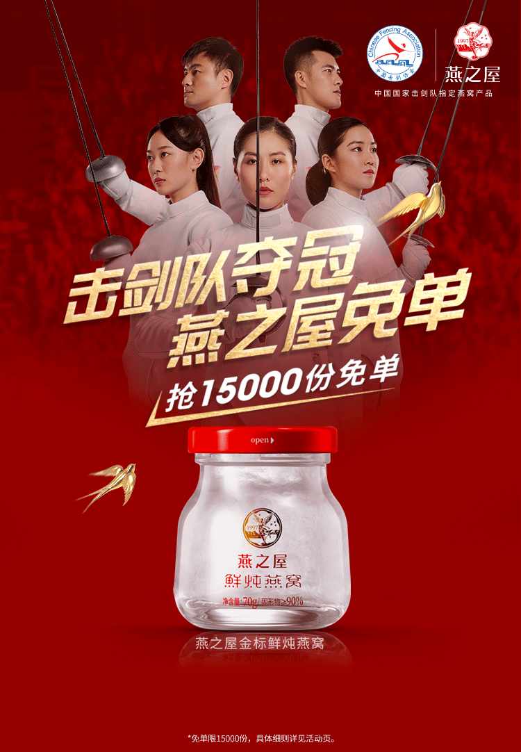 燕之屋于今年1月19日與中國國家擊劍隊官方合作簽約儀式在廈門舉行,同樣的健康理念和奧運精神讓二者高度契合,合作合拍。正如中國國家擊劍隊給國人創(chuàng)造無數(shù)精彩一樣,燕之屋23年專注高品質(zhì)燕窩,也在用自己的產(chǎn)品向消費者展現(xiàn)國貨的力量!7月,燕之屋在全國啟動“擊劍隊奪冠,燕之屋免單”活動,為中國國家擊劍隊鼎力撐腰!