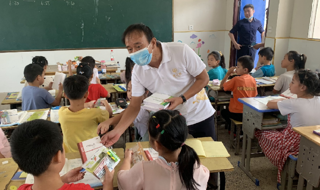 圖:黃石燕之屋負(fù)責(zé)人鐘浩龍為孩子們分發(fā)文具
