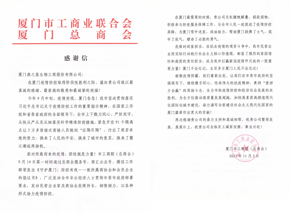 11月3日,燕之屋收到一封來自廈門市工商聯(lián)(總商會(huì))的感謝信,感謝燕之屋在廈門疫情防控取得階段性勝利工作中作出的貢獻(xiàn)。