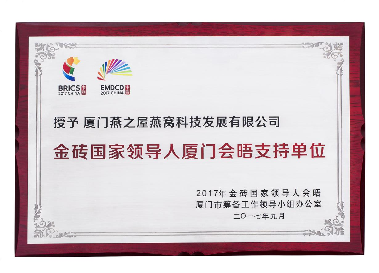 依托強(qiáng)大的品牌力和產(chǎn)品品質(zhì),燕之屋從眾多同類品牌中脫穎而出,以行業(yè)頭部企業(yè)的身份頻頻亮相國(guó)內(nèi)外重要活動(dòng)和高端會(huì)議場(chǎng)合。其中,2017年金磚國(guó)家峰會(huì),燕之屋成為金磚國(guó)家領(lǐng)導(dǎo)人廈門會(huì)晤贊助商,為金磚峰會(huì)榮耀助力,彰顯了燕之屋的行業(yè)標(biāo)桿地位,也證實(shí)了燕之屋的品牌實(shí)力以及產(chǎn)品品質(zhì)深受主流認(rèn)可。