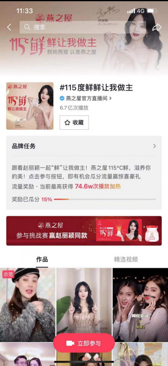 在營銷方面,燕之屋積極運(yùn)用線上直播、抖音種草等互動(dòng)形式,與消費(fèi)者“零距離”對(duì)話,僅在2021年,就舉辦了數(shù)百場直播。并與時(shí)俱進(jìn),將短視頻等新興技術(shù)與KOL種草營銷模式相結(jié)合,與受眾形成更高頻更廣泛的觸達(dá)與鏈接。以燕之屋官宣全新品牌代言人趙麗穎事件為例,官宣消息一發(fā)出便收獲大量熱度,引發(fā)全網(wǎng)廣泛關(guān)注與討論。其中#趙麗穎 115度新身份#的微博熱搜話題,以健康、純粹的新形象,讓消費(fèi)者感知到滋補(bǔ)燕窩的鮮活新風(fēng)尚。趙麗穎抖音“燕之舞”更是引起大量挑戰(zhàn)互動(dòng),#趙麗穎手勢(shì)舞#順勢(shì)霸屏微博熱榜,短時(shí)間抖音播放6.7億,互動(dòng)話題持續(xù)發(fā)酵,相關(guān)熱議不斷。在對(duì)產(chǎn)品進(jìn)行有效曝光的同時(shí),燕之屋也以其自帶的親和力,增加了大眾對(duì)燕之屋品牌的好感度。