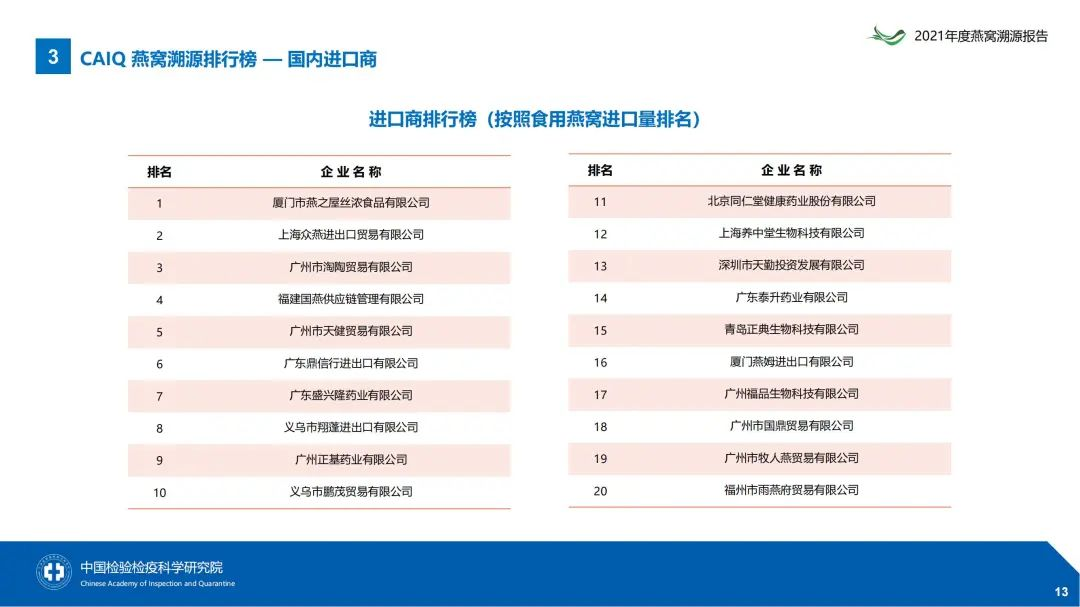 2021年度CAIQ溯源燕窩國(guó)內(nèi)進(jìn)口商排行榜,燕之屋再度榮登榜首