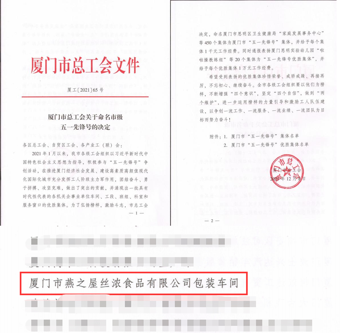 去年12月,接廈門(mén)市總工會(huì)文件廈工[2021]65號(hào)文,《廈門(mén)市總工會(huì)關(guān)于命名市級(jí)五一先鋒號(hào)的決定》,廈門(mén)市燕之屋絲濃食品有限公司包裝車(chē)間榮獲廈門(mén)市“五一先鋒號(hào)”集體榮譽(yù)。