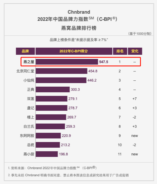 4月20日, 2022年(第十二屆)中國品牌力指數(shù)SM(C-BPI®)品牌排名和分析報告重磅發(fā)布,燕之屋以547.5分的優(yōu)異成績,榮膺食品飲料行業(yè)燕窩品類品牌榜首。