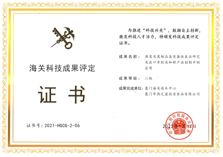 近日,海關(guān)總署正式頒布2021年度海關(guān)科技成果評定結(jié)果,共評定出一級成果9項、二級成果21項、三級成果63項。其中,由燕之屋與廈門海關(guān)技術(shù)中心聯(lián)合完成的科研項目《燕窩及其制品真實屬性表征研究及在口岸把關(guān)和新產(chǎn)品創(chuàng)制中的應(yīng)用》獲評海關(guān)科技成果評定二級。