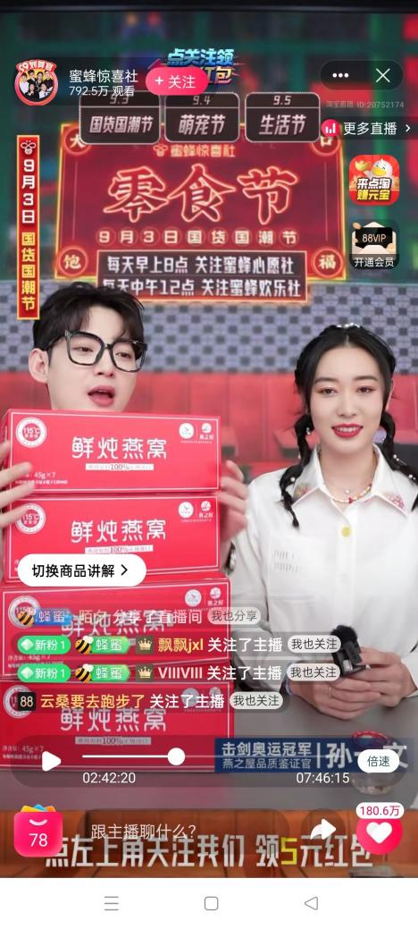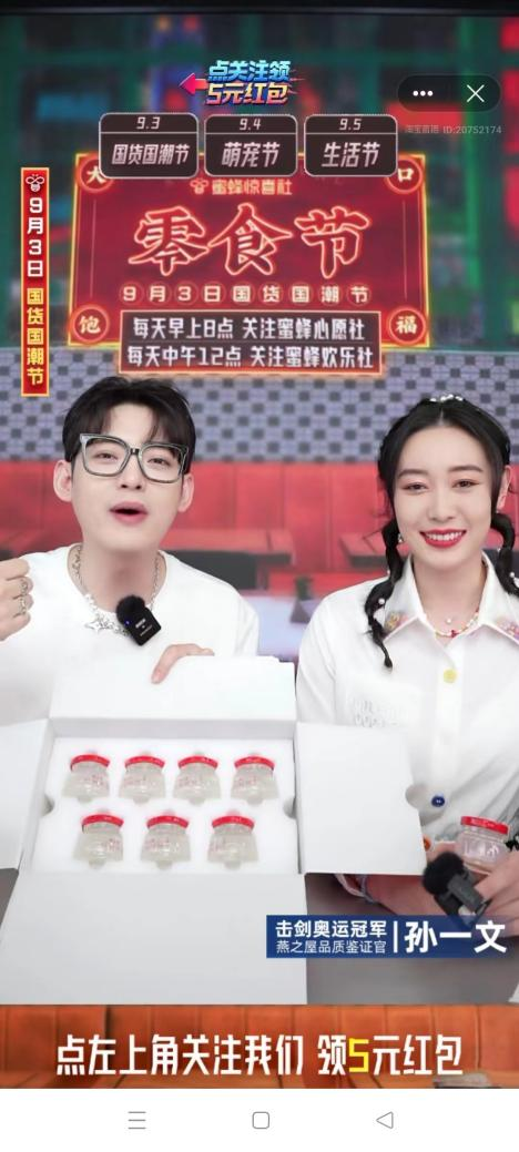 直播開始,孫一文親切地與粉絲們打招呼,并攜手蜜蜂驚喜社主持人在線派送福利,在直播間抽取了5名幸運粉絲送上燕之屋專屬福利——115℃鮮燉燕窩月卡。伴隨著“5、4、3、2、1”的倒計時,獲獎名單揭幕,直播間里人氣一路飆升。在隨后快問快答的環(huán)節(jié)中,孫一文與主持人的精彩互動更是逗樂眾人,在歡笑的氣氛中,傳遞出燕窩產(chǎn)品背后的滋補文化。眾所周知,國家運動員的飲食標(biāo)準(zhǔn)十分嚴(yán)格,除了健康,更重要的還有安全。孫一文也在直播中和大家分享,從健康出發(fā),所有入口的食品都必須經(jīng)過興奮劑檢測。