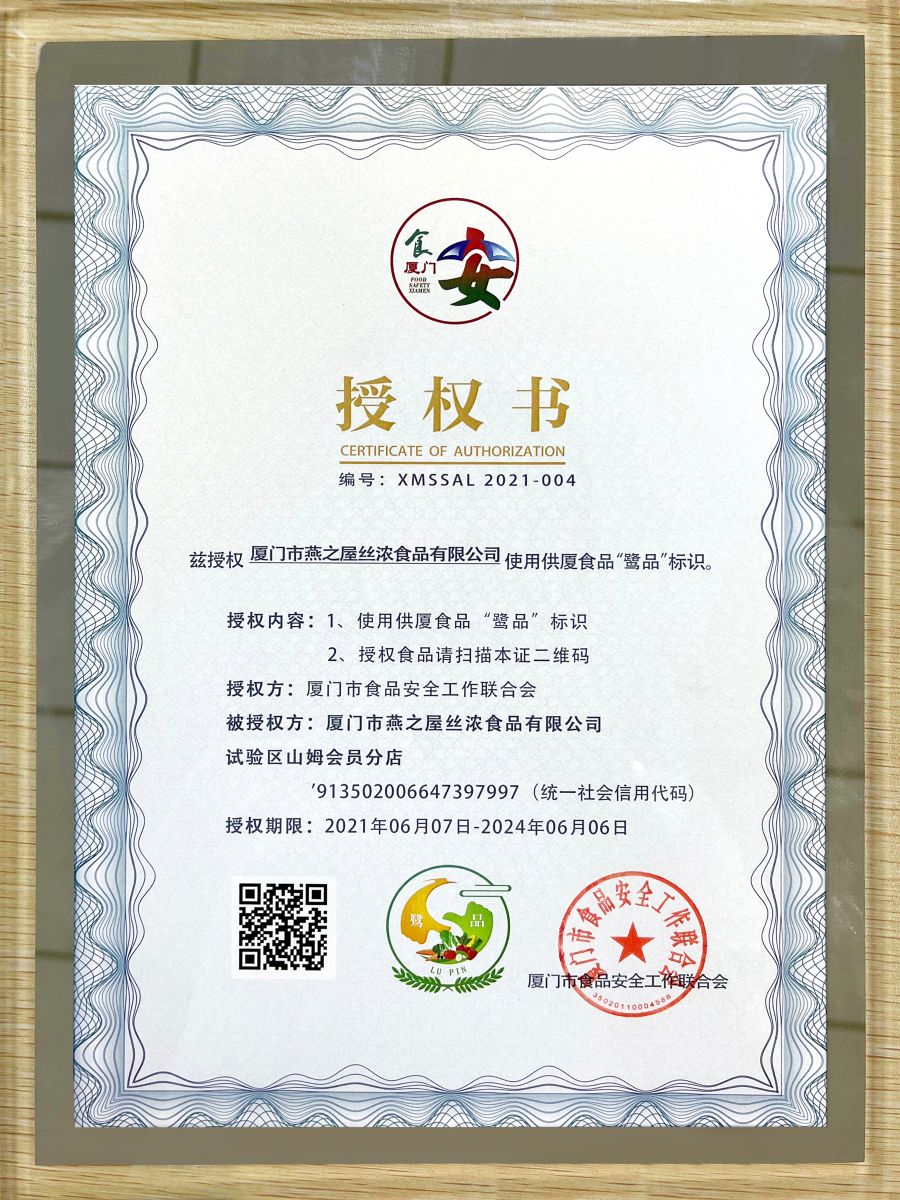 圖:燕之屋獲得供廈食品標(biāo)識“鷺品”授權(quán)使用證書