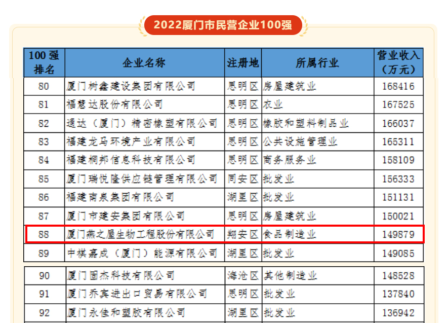喜報(bào)!燕之屋入選廈門(mén)市2022年度龍頭骨干民營(yíng)企業(yè)和2022廈門(mén)市民營(yíng)企業(yè)100強(qiáng)