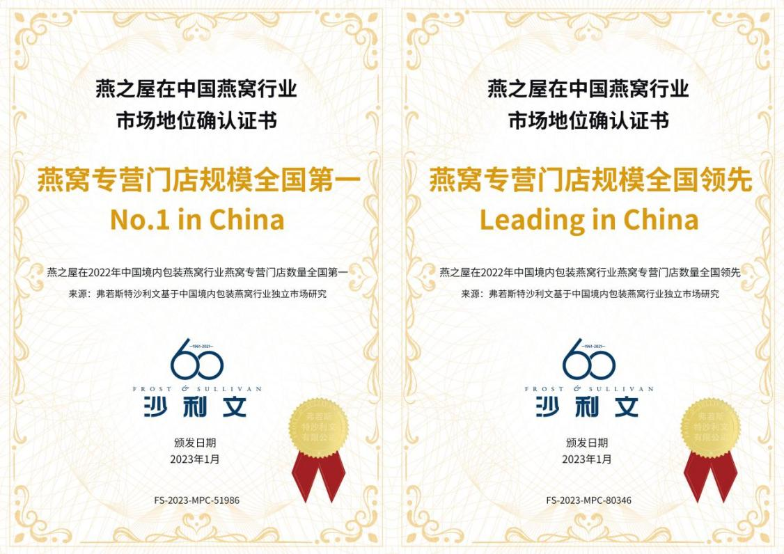近日,燕之屋經(jīng)知名咨詢機構(gòu)弗若斯特沙利文有限公司認(rèn)證,獲得四項2022年度中國燕窩行業(yè)市場地位確認(rèn)證書,分別是燕窩工廠規(guī)模全國最大、燕窩工廠規(guī)模全國領(lǐng)先、燕窩專營門店規(guī)模全國第一、燕窩專營門店規(guī)模全國領(lǐng)先,2022年度雙料全國第一的佳績,足見品牌強勁實力。